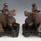 A pair of Chinese carved hardwood figure groups and stands, late 19th/early 20th century, each modelled as a boy kneeling on the back of a recumbent water buffalo with inset glass eyes and ivory teeth detail, the carved and pierced stands of shaped rectangular form, total height 21cm (some faults).