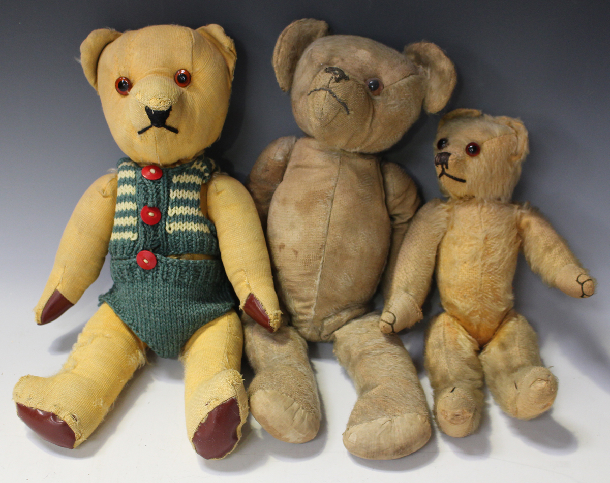 A mid-20th century mohair teddy bear with amber and black eyes, stitched snout and claws and jointed body with fabric pads, height 28cm, together with two other teddy bears (bald patches, faults and repairs).