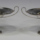 A pair of Edwardian silver bonbon tazze, each shallow circular bowl flanked by two slender scroll handles, raised on a knop stem and stepped circular domed foot, Birmingham 1907 by William Aitken, height 8.3cm.