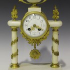 A late 19th century French ormolu and white marble portico mantel clock with eight day movement striking on a bell, the circular enamel dial with black Arabic hours and flower festoons, the case with urn surmount above a pair of laurel entwined turned columns, on a rectangular base and disc feet, height 40.5cm, with pendulum and winding key.