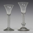 A wine glass, mid-18th century, the drawn trumpet bowl on a multiple spiral airtwist stem and conical foot, height 16.4cm, together with another wine glass, mid-18th century, with bell shaped bowl, the stem with multiple spiral airtwist over-beaded knop, on a domed circular foot, height 18cm (chip to footrim).