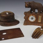 A 20th century Black Forest carved softwood desk barometer/thermometer, the surmount modelled as a bear, height 28cm, together with an artist's model of an articulated hand, a carved wood model of a fedora and an artist's palette. Provenance: from the estate of the late Nellie Lenson-Smith (1928-2017).