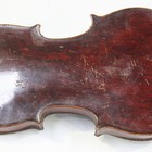 An early 20th century mahogany framed practice violin, the button stamped 'Wolff', length 60cm, together with a child's violin, bearing interior label marked 'Medio Fino', length of back excluding button 26.4cm. Provenance: from the estate of the late Nellie Lenson-Smith (1928-2017).