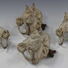 A 19th century cast iron horse tether wall mount in the form of a horse's head, a similar mount with canted rectangular wall plate and a set of four 20th century cast iron examples, together with three wall mounts in the form of bulls' heads and a cast brass model of a bull. Provenance: from the estate of the late Nellie Lenson-Smith (1928-2017).
