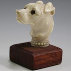 A 19th century carved ivory walking cane handle, modelled in the form of a dog's head with inset glass eyes and beaded collar, height 6cm, later mounted on a wooden plinth.