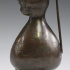 A 19th century German medieval style brown patinated bronze ewer with bearded mask spout, the body inscribed 'Devs et Lumen MDL XXV', raised on three feet, height 19.5cm.