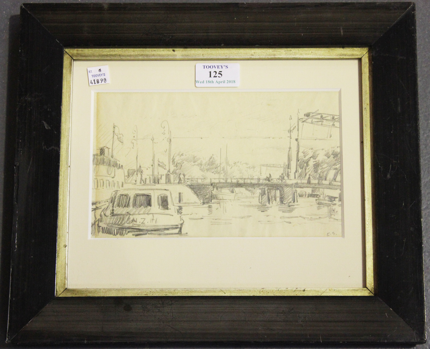 Elliott Seabrooke - Canal Scene with Barge and Bridge, 20th century pencil drawing, signed with initials, 12.5cm x 21cm, within an ebonized and partially gilt frame.