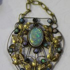 A Victorian gold mounted carved vari-coloured agate scarab brooch, the back engraved with an Egyptian figural motif, width 3.2cm, an opal pendant, pierced in a foliate design in the Arts and Crafts taste (three small opals lacking), length 9.2cm, a Victorian silver mounted banded grey agate brooch in the form of an Irish Tara brooch, probably Scottish, width 4.3cm, and a blue, black and grey enamelled necklace, the front with fringed drops, on a boltring clasp, length 38cm.