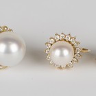 A gold, diamond and South Sea cultured pearl ring, mounted with a single South Sea cultured pearl within a surround of circular cut diamonds, between diamond set four stone shoulders, detailed '750, ring size approx K, and a pair of gold, cultured pearl and diamond earrings, each mounted with a cultured pearl within a surround of circular cut diamonds, with screw fittings, detailed 'K18'.
