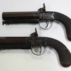 A pair of 24 bore percussion sidehammer boxlock travelling pistols by McLoughlin, Cheltenham, with browned twist sighted octagonal barrels, length 9cm, signed on top flat, border and scroll engraved coloured hardened frames and hammers, blued trigger guards and swivel ramrods, rounded chequered walnut butts with vacant oval white metal escutcheons, contained within their blue baize lined, brass bound mahogany case with copper powder flask and nipple key (lacking pricker, lock replaced with key).
