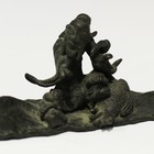 A Chinese bronze scroll weight, possibly 17th/18th century, modelled with a seated figure and crane resting on a leaf shaped base, length 13cm, together with a gilt bronze Buddha, height 12.5cm, and two small bronze standing figures.