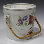 An oversize 18th century style Dutch Delft bottle vase, 20th century, the octagonal bulbous body painted in shades of blue with a peacock and fantastical birds amongst chinoiserie plants, the neck with onion shaped top, blue painted and impressed factory marks to base, height 53cm, together with a reproduction ironstone style footbath and a pottery wash pail and liner.