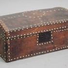 A 19th century dome top trunk, later re-covered in brown leather with brass studded borders and wrought iron handles, the interior with applied label detailed 'Thos Jenkins Sadler & Harness Makers Llanelly', length 63cm.