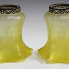 A pair of Edwardian yellow frosted glass ceiling light shades with acid etched palmettes and copper mounted rims, height 14.5cm. Provenance: from the estate of the late Nellie Lenson-Smith (1928-2017).