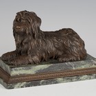 A late 19th/early 20th century brown patinated electroform model of a recumbent Tibetan terrier, raised on a green marble plinth with an applied stiff leaf band, length 20.5cm.