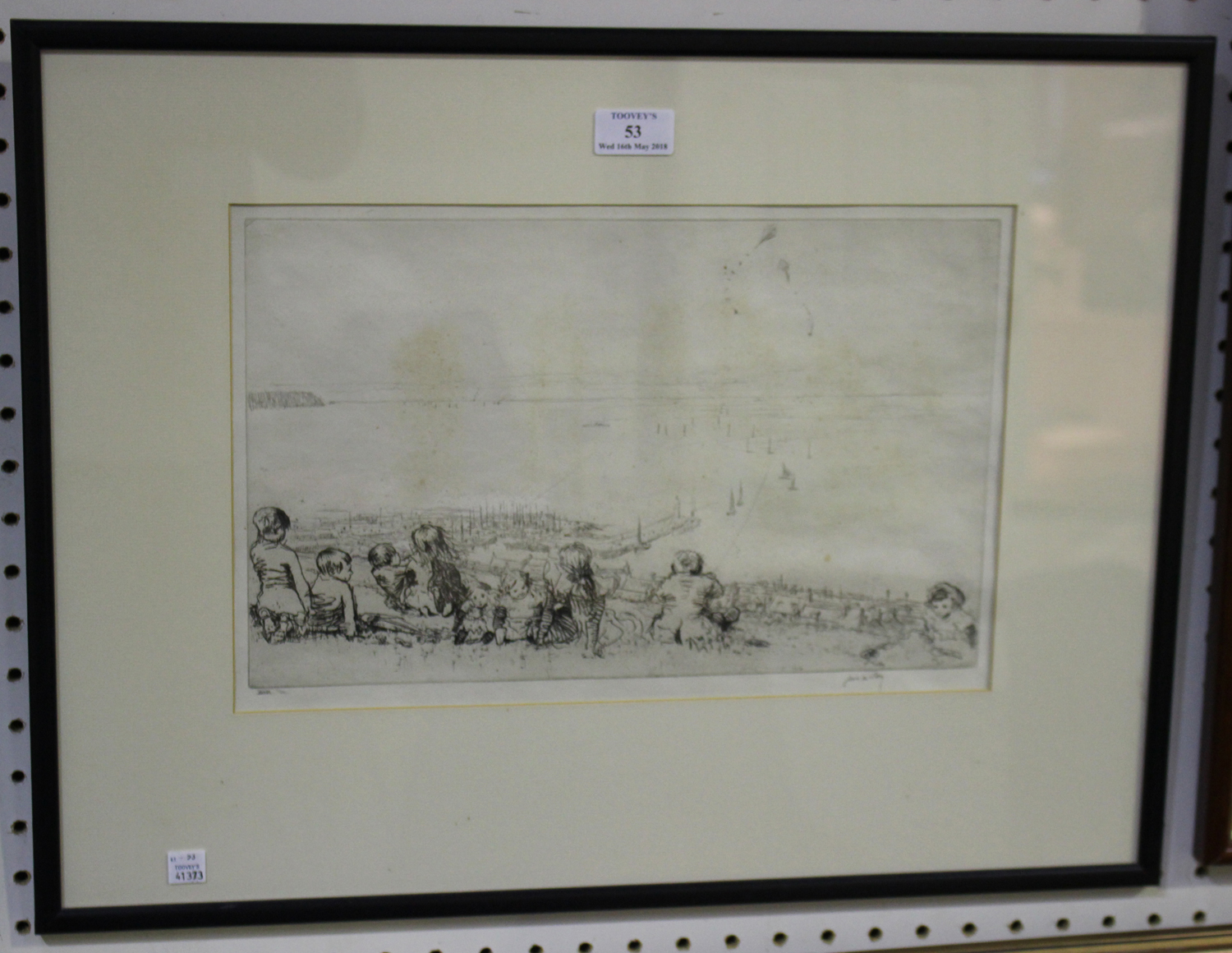 James McBey - Macduff, the Moray Firth, with Children flying Kites in the foreground, etching, signed and editioned XXXIX in ink, circa 1914, 25cm x 38cm, within an ebonized frame.