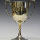 A late Victorian silver 'Goldsmiths Institute Boxing Club' trophy, the 'U' shaped body engraved with presentation inscription '10st 4lb Open Competition January 1899 won by E. Mann', flanked by a pair of handles, on a beaded knop stem and circular foot, Sheffield 1898 by Atkin Brothers, height 25.5cm.