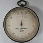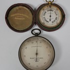 A late 19th century gilt brass pocket barometer by Negretti & Zambra, the silvered dial numbered '11910', diameter 5cm, within original leather case, together with a brass cased pocket barometer by Negretti & Zambra, the silvered dial numbered '15306', diameter 7.1cm.