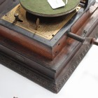 A late 19th century phonograph/gramophone, the 6" turntable and 4" cylinder with clockwork winding movement, housed within an oak case, bearing plaque inscribed 'Patent Applied For', width 32cm, together with horn and winding handle.