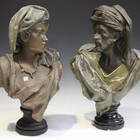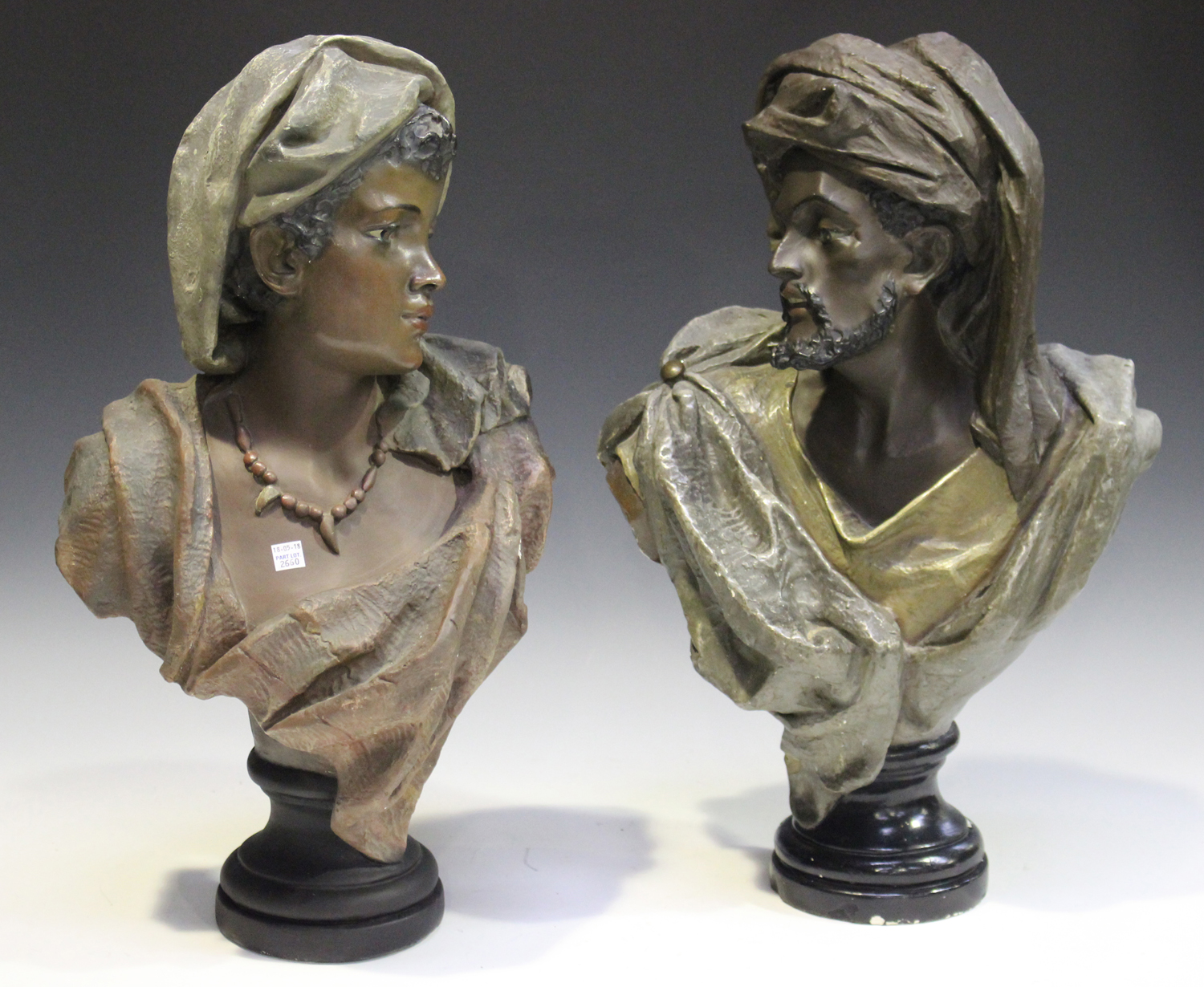A near pair of 20th century Continental cast plaster head and shoulders portrait busts of a Moorish male and female, raised on turned bases, height 57cm.