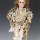 An SFBJ bisque head doll, impressed '7', with brown wig, closing brown eyes, pierced ears, open mouth showing upper teeth and jointed composition body, height 51cm, clothed (body has overpainting and some playwear), together with a wicker doll's chair.