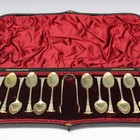 A set of twelve late Victorian silver gilt floral decorated Onslow pattern teaspoons and pair of matching sugar tongs, London 1892 by James Wakely & Frank Clarke Wheeler, cased.
