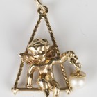 A 9ct gold pendant, designed as a cherub holding a cultured pearl, seated on a swing, London 1990 by PB, length 3.5cm.