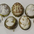 A 9ct gold mounted oval shell cameo ring, designed as the portrait of a lady, another 9ct gold mounted oval shell cameo ring, designed as the Three Graces, a 9ct gold mounted oval shell cameo brooch, designed as the Three Graces within a ribbon twist surround, and four further oval shell cameo brooches.