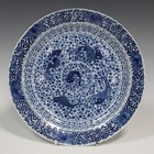 A Chinese blue and white porcelain circular dish, Kangxi style but 19th century, the centre painted with fish within a foliate and floral rim, underglaze blue lingzhi fungus mark and double ring to base, diameter 25.5cm (minor rim hairline and minor rim chips).
