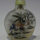 A Chinese inside painted glass snuff bottle, 20th century, of flattened round form, one side painted with two foxes in a landscape beneath three lines of black text and two red seals, the reverse with two dogs and plants, height 6.8cm, with stopper.