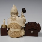 A Japanese carved ivory and wood okimono figure group of a mask maker with mother-of-pearl and horn detail, by Kyokusui, Meiji period, the seated artisan working on an Okame mask, flanked by a large Hannya mask, kodansu and chamberstick, inset red lacquer signature plaque to base, height 8.5cm, together with a stained wood scroll stand. Note: for an illustrated example by the same carver and illustration of signature, see pages 152 and 153 of 'The Golden Age of Japanese Okimono' by Laura Bordignon.