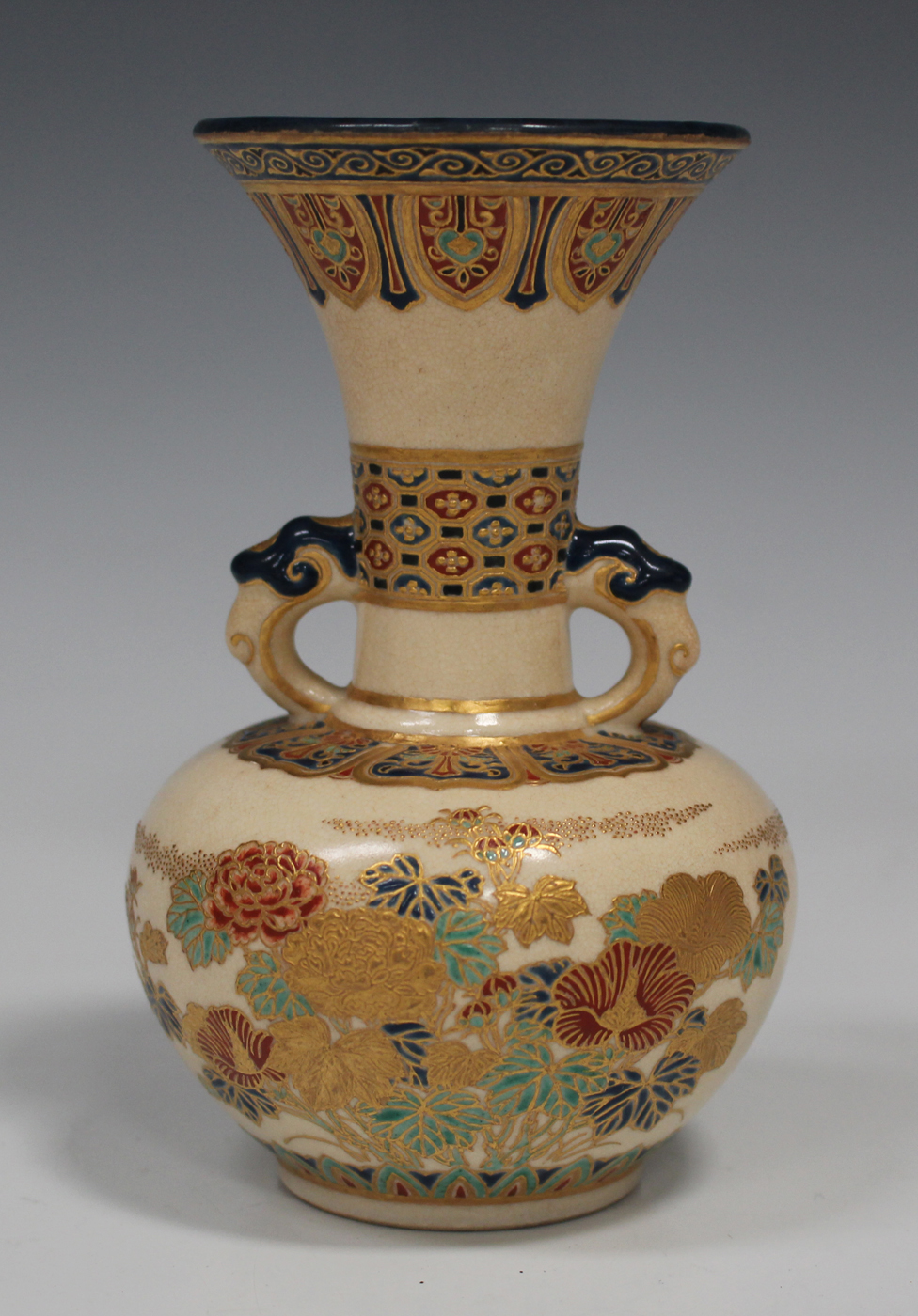 A Japanese Satsuma earthenware vase, Meiji period, the squat globular body thickly enamelled and gilt with flowers beneath a flared neck, decorated with a lappet rim and simulated brocade band, blue enamelled Shimazu mon and gilt two character signature to base, height 14.3cm.