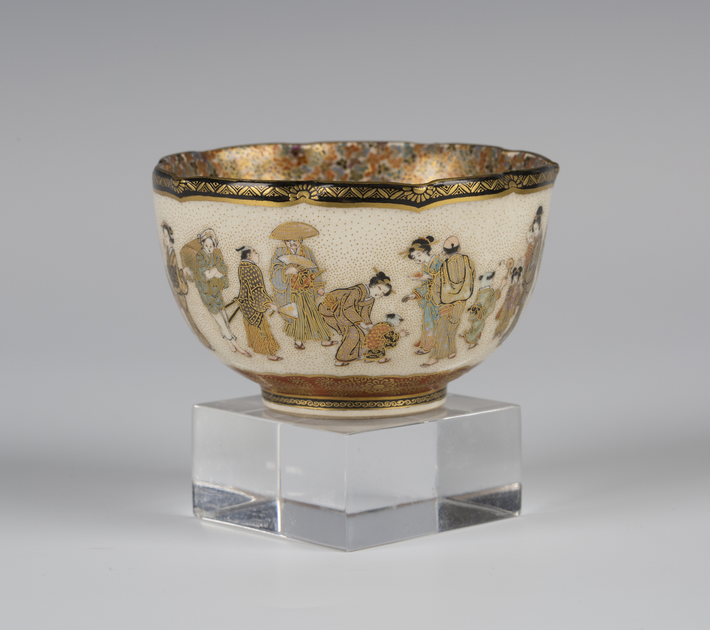 A Japanese Satsuma earthenware bowl by Juzan, Meiji period, of circular form with leaf shaped rim, the exterior finely painted and gilt with a continuous procession of men, women and children against a gilt speckled ground, the interior filled with dense polychrome and gilt butterflies, iron red, black and gilt signature to base, height 5.3cm, diameter 8.7cm.