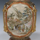 A Japanese Satsuma earthenware vase by Yabu Meizan, Meiji period, the stout ovoid body painted with three panels of figures in a mountainous landscape, a mountainous winter landscape with pavilions, bridge and pleasure barge and Kannon seated on the back of an elephant, all within moulded barbed edge framing, divided by moulded gilt pendant tassels, reserved against a ground of irises and butterflies between simulated brocade borders and key fret rim, gilt signature to base, height 20cm (lacking cover).