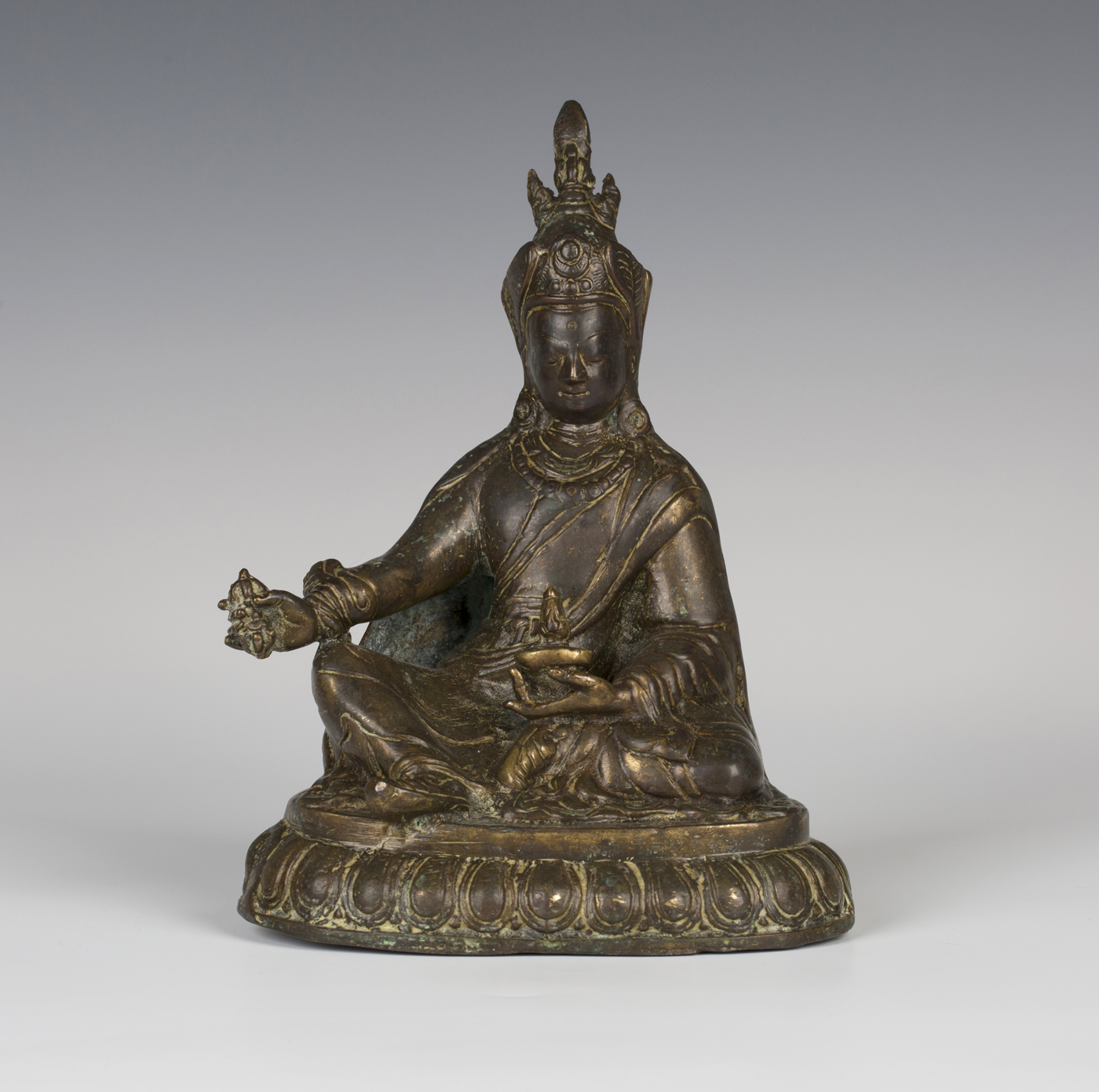 A Tibetan bronze figure of Padma-Sambhava, 15th century, modelled seated in lalitisana wearing a headdress, long robe and beaded jewellery, holding a dorje in his right hand and a vase of immortality in his left, on a lotus moulded base, height 18.5cm.