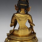 A Sino-Tibetan gilt bronze figure of Tara, probably 20th century, modelled seated in lalitisana holding her hands in vitarka and varada mudra, wearing a headdress, celestial scarf and beaded jewellery, resting her right foot on a lotus emanating from a double lotus base, height 22.5cm.
