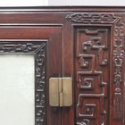 A Chinese hardwood cupboard, late Qing dynasty, the glazed door with carved scroll and prunus surround, flanked by vertical panels of dragon scroll motifs and shou characters, on scroll carved short feet, height 180.5cm, depth 68cm, width 119cm.