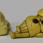 A Japanese carved ivory netsuke, probably Edo period, modelled as a figure carrying a fox on his back, unsigned, height 5.7cm, together with a Japanese ivory netsuke, Meiji period, modelled as a cauldron above witch and attendant boy, height 3.1cm.