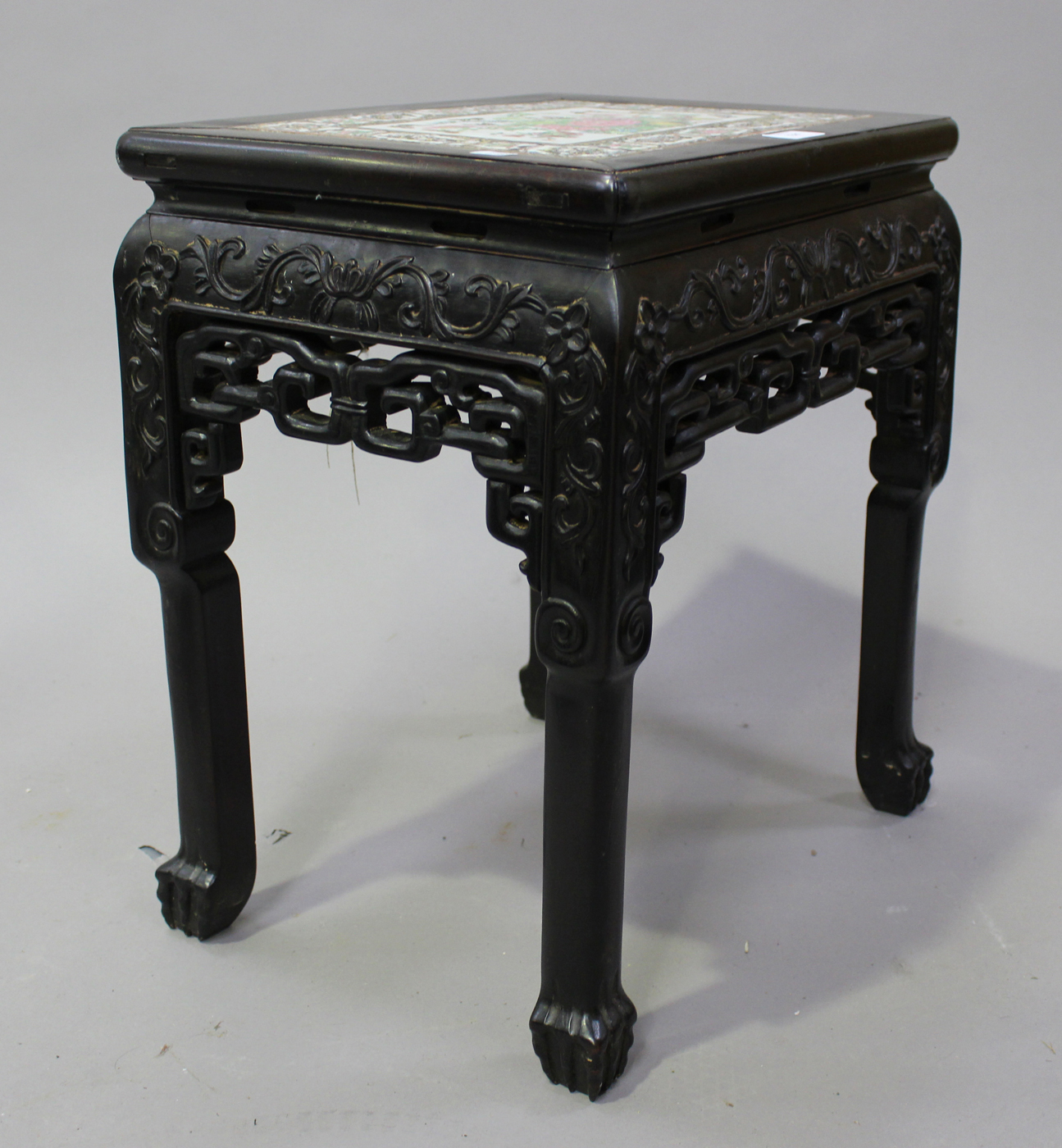 A Chinese hardwood and porcelain stand, late 19th century, the rectangular top inset with a Canton famille rose porcelain panel of butterflies, fruit and flowers, above a carved and pierced frieze, on block legs and claw and ball feet, length 42cm, height 48cm.