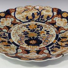 A pair of Japanese Imari porcelain fluted chargers, Meiji period, each painted with a central flower charged jardinière within a border of birds, flowers and simulated brocade, diameter 55.5cm.