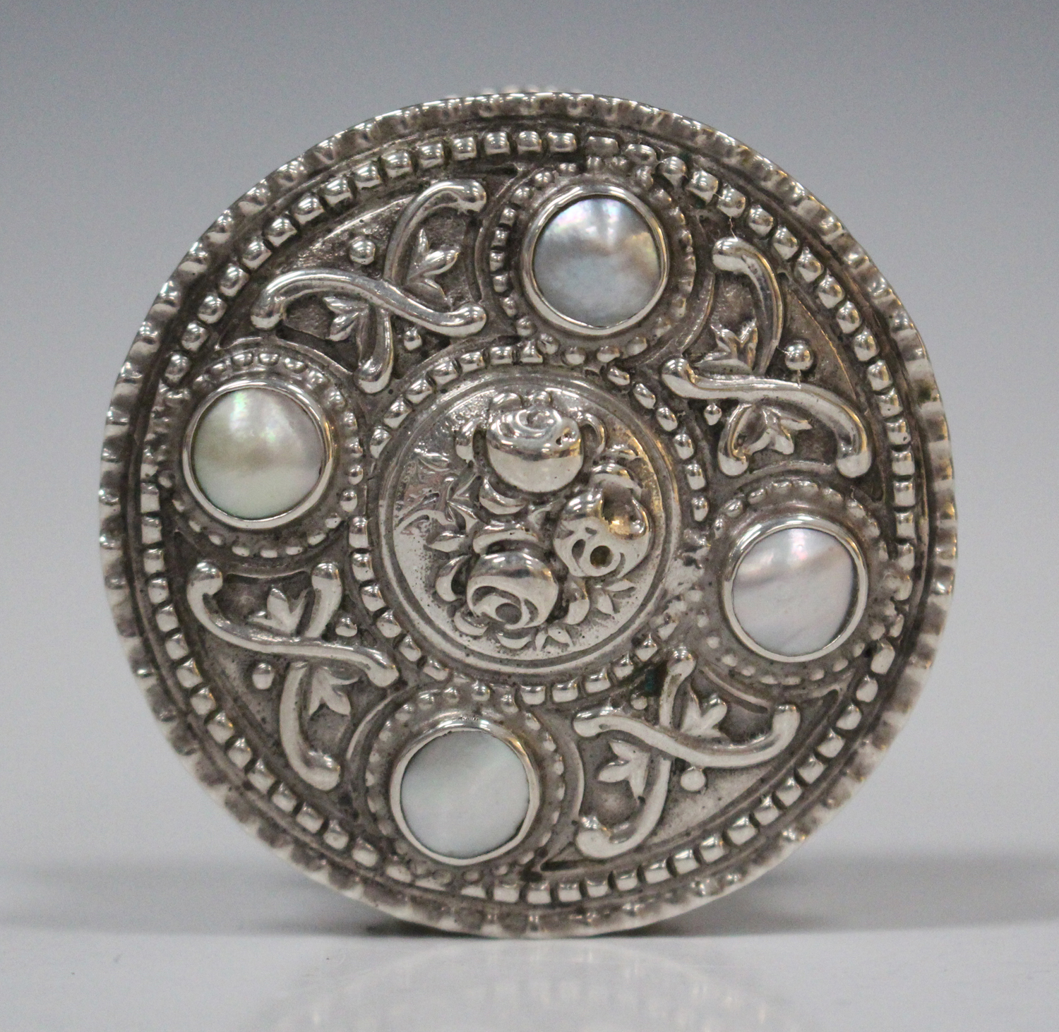 A late 19th/early 20th century German .800 silver circular box, the hinged lid inset with mother-of-pearl, diameter 5.5cm.