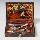 A 19th century tortoiseshell cased silver tea serving set, the velvet lined interior fitted with a set of ten Fiddle pattern teaspoons, tea strainer, sugar tongs, caddy spoon and caddy shovel, the tortoiseshell case of rectangular form with hinged lid, length 19.7cm.