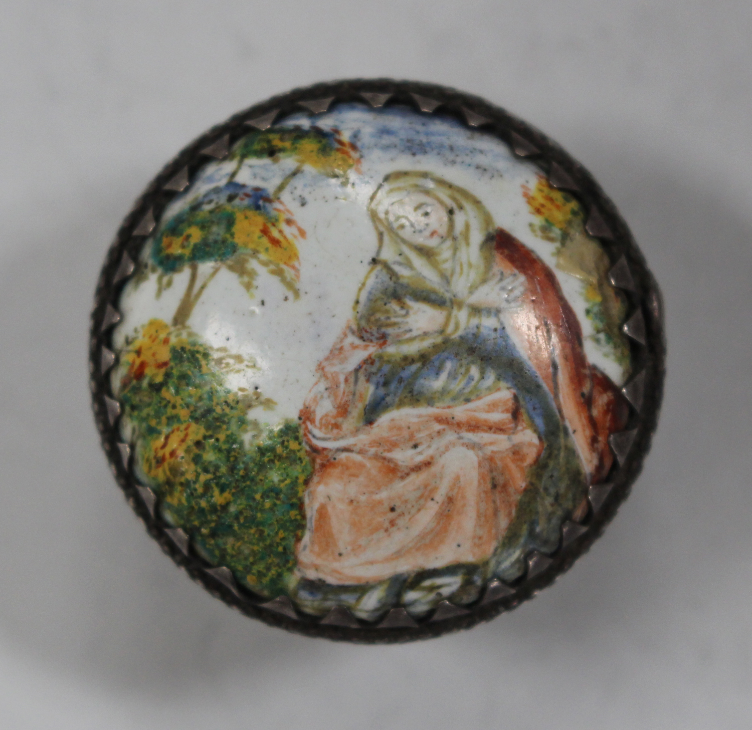 An 18th century Continental silver filigree and enamel counter box, the cover inset with an enamel panel depicting the Madonna and Child, the sides pierced with foliate scrolls, height 2.8cm.