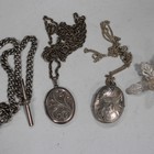 Two silver oval pendant lockets with neckchains, a silver curblink watch Albert chain, fitted with a T-bar and two swivels, and a collection of costume jewellery, including ladies' wristwatches, brooches and imitation pearls.