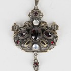 A garnet and moonstone pendant in a pierced openwork design, mounted with the principal oval cut garnet to the centre, probably Austro-Hungarian, the suspension loop detailed 'RKJ', length 7.5cm.