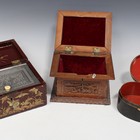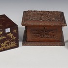 A Chinese Canton export sandalwood rectangular box and cover, mid/late 19th century, the hinged cover and sides carved in relief with village scenes of figures, pavilions and trees, length 19.2cm, together with a Chinese lacquer tea caddy with pewter interior, length 21.5cm, and a black lacquer oval box, the hinged lid with gilt decoration, length 17cm (some faults).