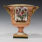A Continental porcelain vase, 20th century, of campana urn form, decorated with opposing panels of flowers against a salmon pink and gilt foliate ground, flanked by ram's head handles, height 26cm.