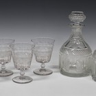A pair of cut glass decanters and stoppers, late 19th century, with panels of hobnail cut detail beneath a hobnail band and the step cut necks, height 23cm, together with four similar cut rummers (one chipped), a part suite of glasses and three tinted roemers (minor faults).