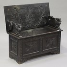 A late Victorian carved oak box seat monk's bench, on bracket feet, height 66cm, width 107cm, depth 50cm.