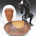 A mid-20th century African carved hardwood figure of stylized form, height 53cm, together with a Baule tribe mask, bearing 'East Sussex Arts Club' label to reverse, height 39.5cm, and an African carved hardwood bowl, diameter 42cm.